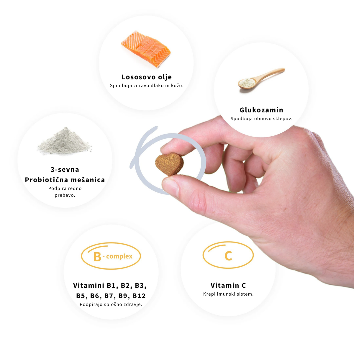 Aktivne sestavine (na 1 žvečljiv priboljšek 2,5 g): glukozamin HCl: 200 mg, metilsulfonimetan: 100 mg, hondroitin: 75 mg, lososovo olje: 75 mg, vitamin C: 20 mg, vitamin B3: 15 mg, koencim Q10: 10 mg, vitamin B1: 2 mg, vitamin B2: 1 mg, vitamin B6: 1 mg, vitamin B5: 1 mg, vitamin B9: 225 mcg, vitamin B7: 20 mcg, vitamin B12: 5 mcg, mešanica probiotikov s 3 sevi: 500 milijonov CFU.