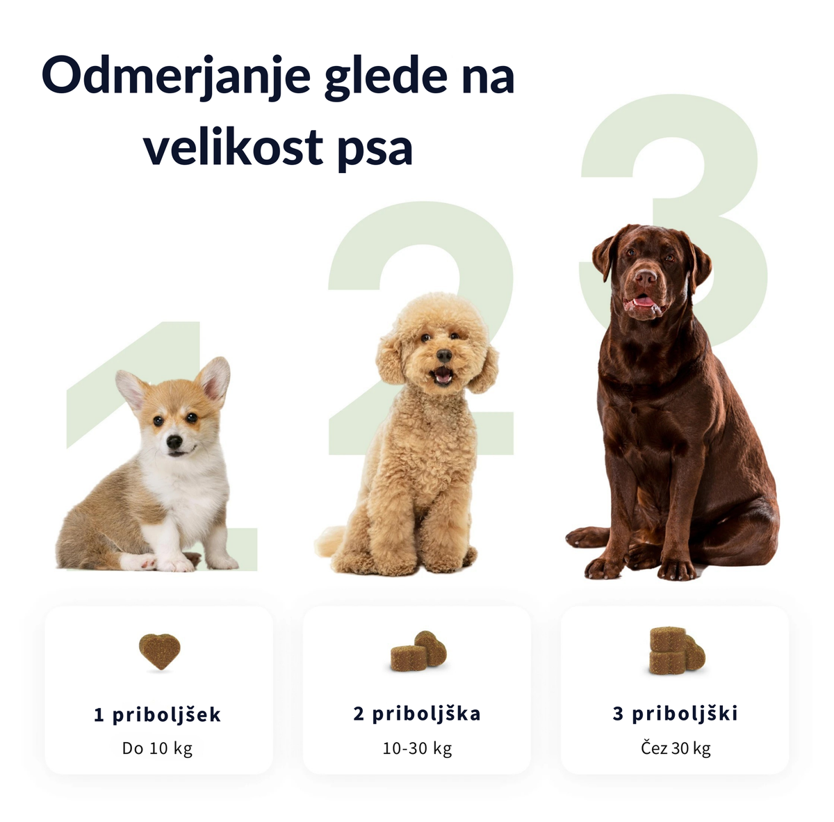 Eno pakiranje vsebuje 60 priboljškov. Priporočeno odmerjanje glede na velikost psa: